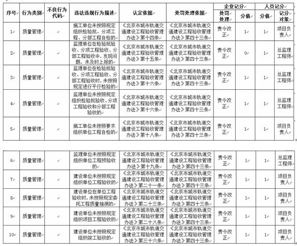 第四十三条 违反本办法有关规定,由住房城乡建设行政主管部门责令改正,并按照《北京市建筑企业违法违规行为记分标准》、《北京市建筑业企业资质及人员资格动态监督管理暂行办法》、《北京市城市轨道交通建设工程验收管理办法违法违规行为记分标准》进行动态监管记分处理。