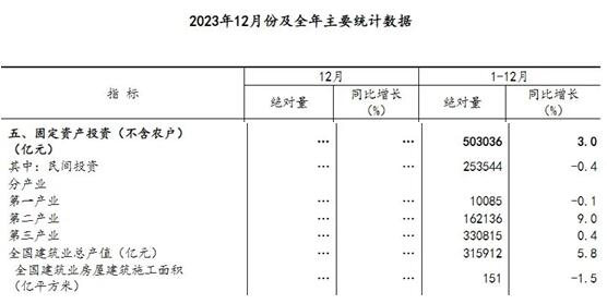 2023年,全国固定资产投资(不含农户)503036亿元,比上年增长3.0%(按可比口径计算),增速比1—11月份加快0.1个百分点。其中,制造业投资增长6.5%,增速加快0.2个百分点;基础设施投资(不含电力、热力、燃气及水生产和供应业)增长5.9%,增速加快0.1个百分点。从环比看,12月份固定资产投资(不含农户)增长0.09%。2023年,民间固定资产投资253544亿元,比上年下降0.4%,降幅比1—11月份收窄0.1个百分点。