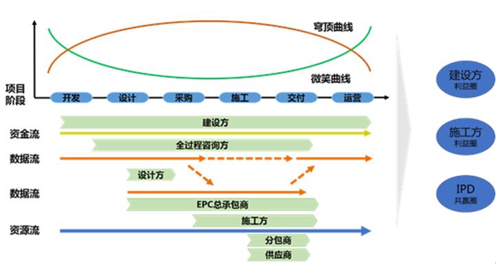 我们认为转型更核心的是通过数据流形成两个价值圈。第一个价值圈是建设方围绕着资金流,与咨询方和设计方形成。比如在将来数字化的社会里面,全过程会变得更加重要,很多建设方没有数字化的能力,这时候需要一个全过程的咨询方来帮助他们提升对数字化的掌握。第二个价值圈是施工方和相关分包方、供应商。传统情况下主要是围绕现场资源流展开工作,对工程建造信息了解最深。这两个价值圈的区别在于甲方价值圈里面主要是围绕着项目阶段微笑曲线一前一后两个数据,而施工方主要掌握整个施工阶段数据。两个价值圈本质上是交付模式和信息掌握的竞争。如果有一方将数据统一,掌握话语权,那么其价值链将会得到提升。