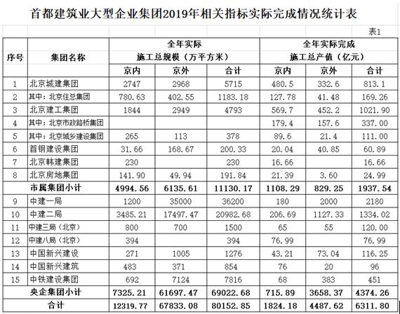 一、首都建筑业大型企业集团2020年计划施工总规模持续增长