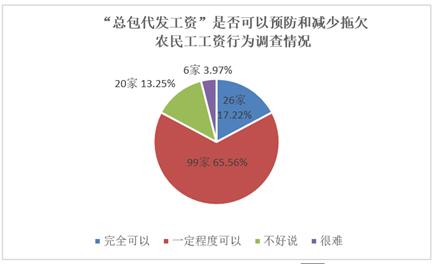 本问题共有151家企业填写,其中总承包企业50家,劳务分包企业87家,专业承包企业14家。认为“施工总承包单位代发工资”举措完全可以预防和减少拖欠农民工工资行为发生的企业26家,占比17.22%;认为“施工总承包单位代发工资”举措一定程度可以预防和减少拖欠农民工工资行为发生的企业99家,占比65.56%;认为“施工总承包单位代发工资”举措很难说可以预防和减少拖欠农民工工资行为发生的企业20家,占比13.25%;认为“施工总承包单位代发工资”举措不能预防和减少拖欠农民工工资行为发生的企业6家,占比3.97%。