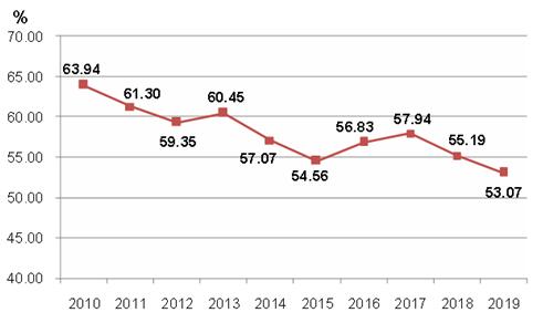 图102010-2019年全国建筑业企业新签合同额占合同总额比例
