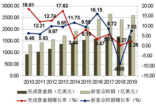 2019年,我国对外承包工程业务完成营业额1729亿美元,比上年增长2.28%,增速比上年提高2.01个百分点。新签合同额2602.5亿美元,比上年增长7.63%,增速比上年增加了16.48个百分点(图13)。